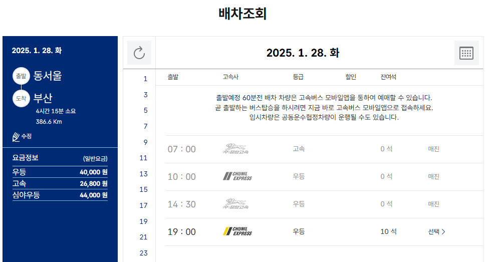 - 출발 1시간 이내 차량: [고속버스 티머니 앱]을 통해 남은 좌석을 예매할 수 있습니다.