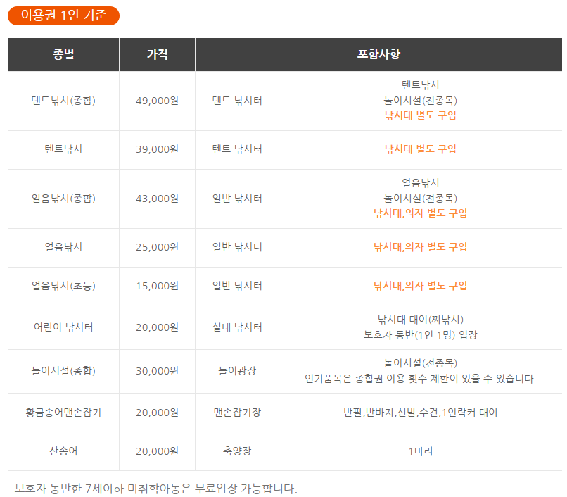 - 얼음 낚시 종합권: 43,000원 (얼음낚시 + 놀이시설 포함)